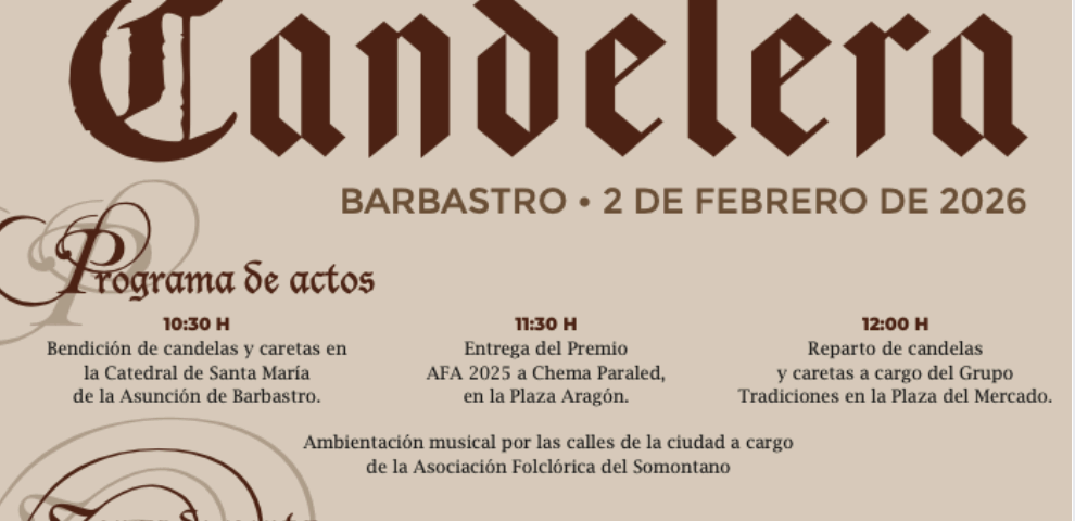 Barbastro celebrará el próximo 2 de febrero la 514ª edición de la Feria de la Candelera, una de las ferias más antiguas de Aragón, que contará este año con la participación confirmada de 316 expositores procedentes de 14 comunidades autónomas diferentes. Entre los productos expuestos habrá maquinaria agrícola, plantero, agroalimentación, artesanía, textil y bazar. Como en ediciones anteriores, el certamen incluirá el tradicional reparto y bendición de alrededor de 7.000 candelas y 3.000 caretas.