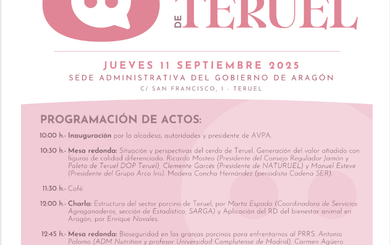 Tras una pausa para café a las 11:30, la jornada continuará a las 12:00 con una sesión técnica. Marta Espada, coordinadora de Servicios Agroganaderos de SARGA, presentará un análisis de la estructura productiva del sector porcino en Teruel. A continuación, Enrique Novales, director general de Calidad y Seguridad Alimentaria del Gobierno de Aragón, abordará la aplicación del Real Decreto sobre bienestar animal en explotaciones porcinas.