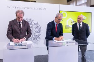 Feria de Zaragoza y la Federación Española de Municipios y Provincias (FEMP) han formalizado esta mañana un acuerdo de colaboración destinado a reforzar la proyección institucional y sectorial de CITY.360. El acto, celebrado en el Ayuntamiento de Zaragoza, ha contado con la presencia del presidente de Feria de Zaragoza, Jorge Villarroya; el consejero de Economía del Ayuntamiento de Zaragoza, Carlos Gimeno y el secretario general de la FEMP, Luis Martínez Sicluna. Ambos han suscrito el acuerdo que refuerza la participación institucional de los entes locales en las dos primeras ediciones de CITY.360.
